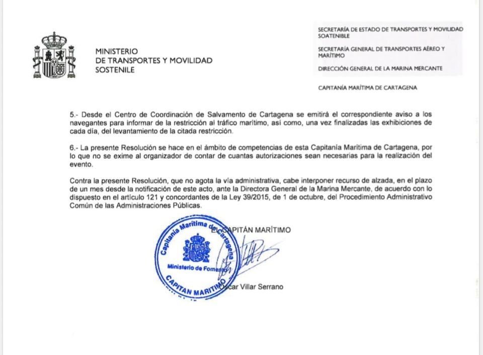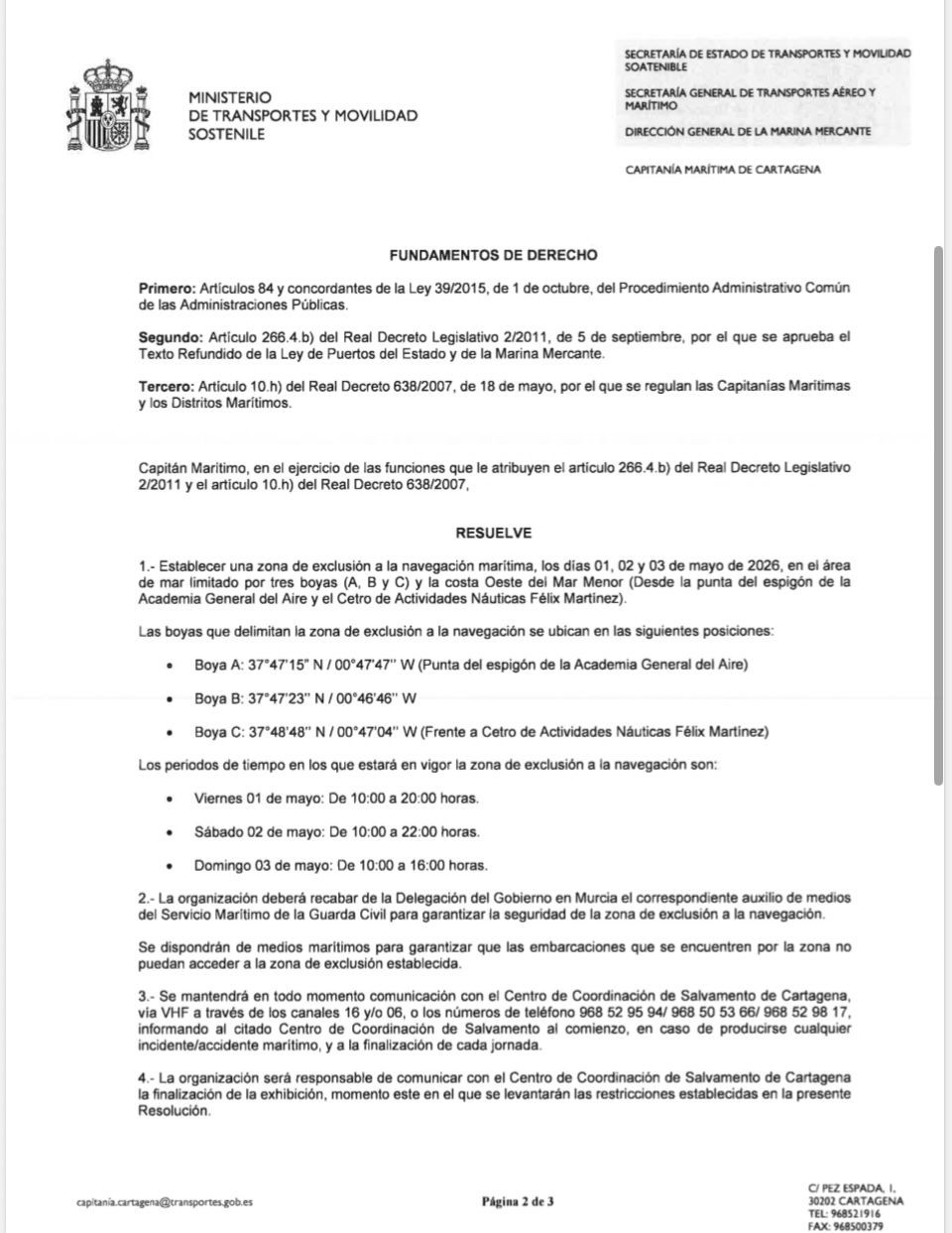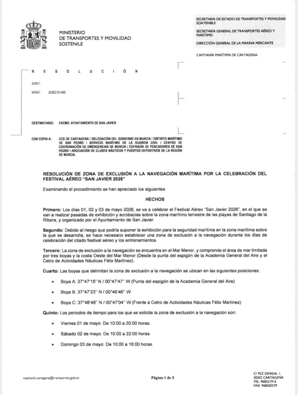 Resolución de zona de exclusión a la navegación. Festival Aéreo San Javier 2026